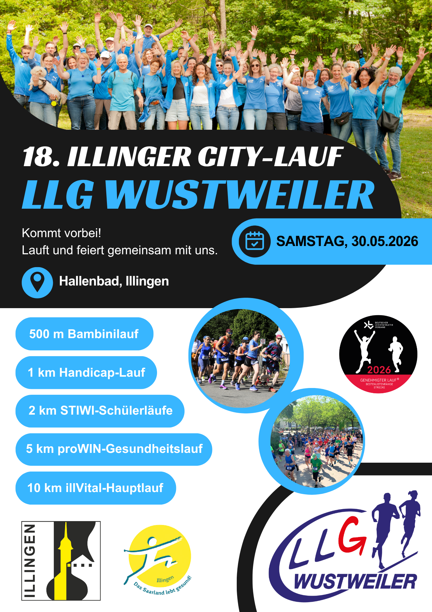 🏃♂️ 18. Illinger LLG City-Lauf 🏃♀️ 📅 Samstag, 30. Mai 2026📍 Am Hallenbad Illingen, Kapellenstraße 82, 66557 Illingen Freut euch auf einen abwechslungsreichen Rundkurs mit tollem Panorama! 🌄 🍔 Siegerehrung