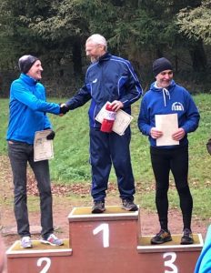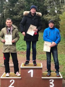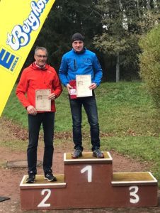Die Herren durften 2 Runden zu insgesamt 4060 m laufen. Ein Novum, Heinz lief in lang. Hats so noch nicht gegeben und stellte sich auch schnell als Blödsinn heraus. Aus dem Stadion heraus ging es gleich einige hundert Meter im Wald bergauf. Schon war der Körper auf Volldampf und die langen Klamotten unnötig. Markus Krämer stört so etwas nicht. In ganz starken 17:39 min. über die 4060 m belegte er Platz 3 AK M50. Heinz folgte mit gehörig Abstand in19:12 min. auf Platz 2 der AK M60.