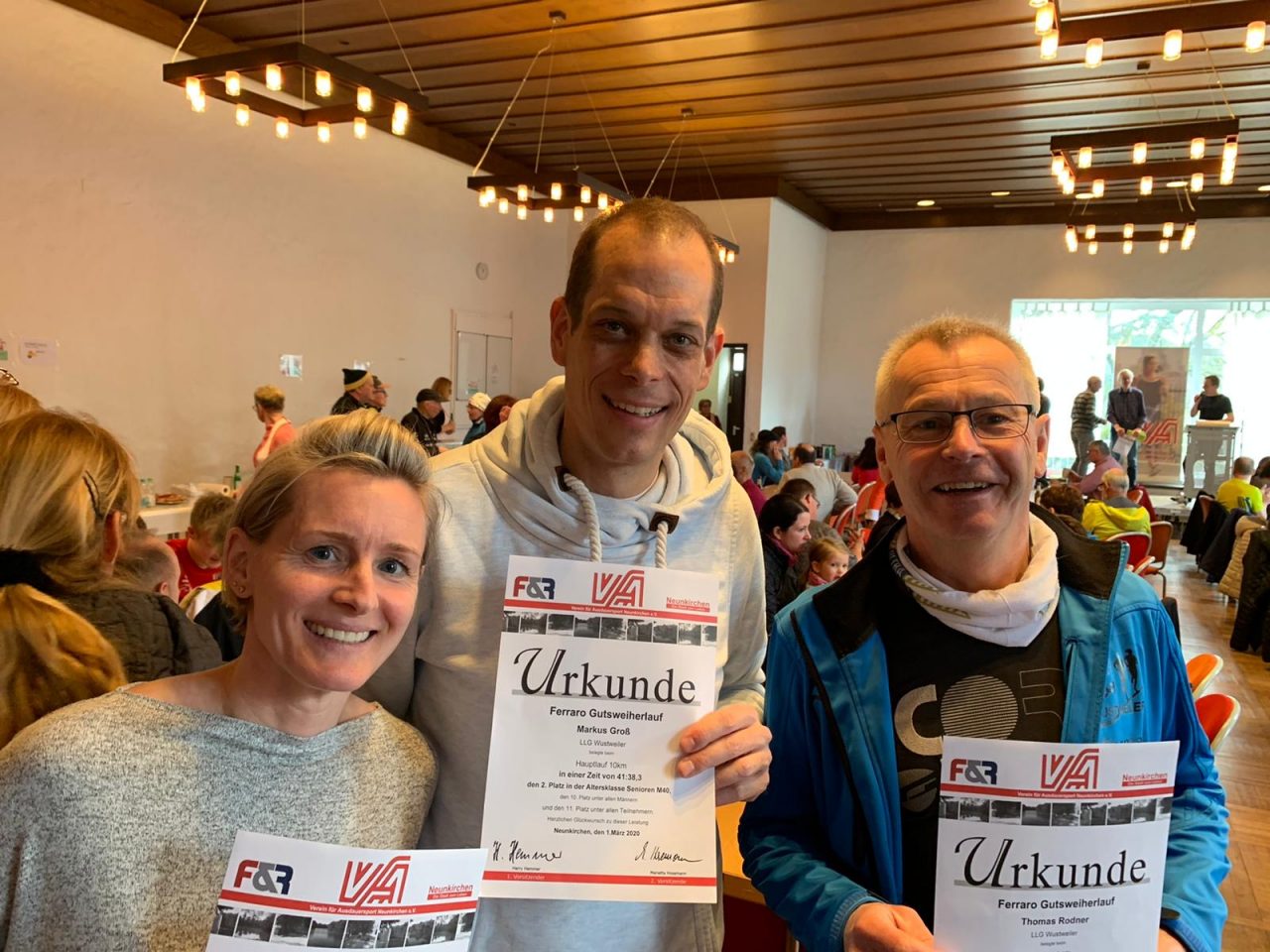 Markus mit druckfrischem LLG-Trikot verpasste als Gesamt 11. nur knapp die Top Ten, hielt sich aber als 2. M40 in 41:38 min. schadlos. Ebenso zweite Plätze erkämpften sich Thomas in 46:56 min. in der M 55 und Daniela in 48:26 min. in der W 35. Rene konnte sich trotz schwerer Strecke über eine neue pB in 56:04 freuen. Auch die anderen haben gut gekämpft, wie auf den Bildern zu sehen ist.