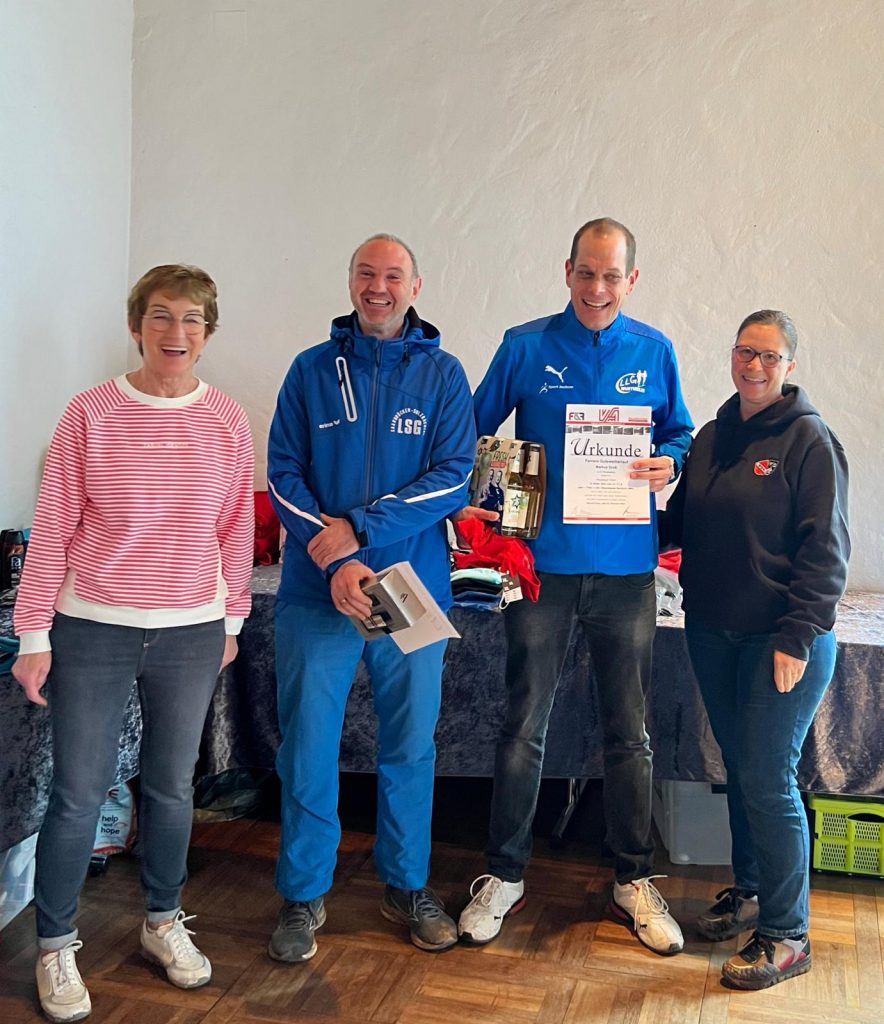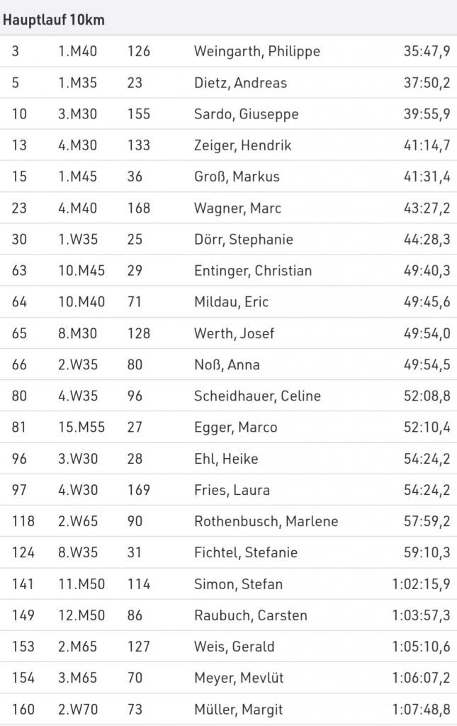 Die restlichen 22 Starter wählten die 10 km. Nach einer Einführungsrunde um den Weiher, ging es auf einer profilierten Strecke mit mehreren Wendepunkten durch den Wald. Obwohl Sammy von unseren Freunden der LTF Marpingen an der Spitze nicht einzuholen war, zeigte unser frischgebackener 1. Vorsitzender Philippe, dass er immernoch vorne mit dabei ist. Zwar musste er sich am Ende dem ebenfalls deutlich jüngeren Zweitplatzierten geschlagen geben, Platz 3 im Gesamtfeld und der AK-Sieg waren ihm aber nicht zu nehmen. LLG-intern folgten Andreas (Platz 1 AK) und Giuseppe (Platz 3 AK), für den der Lauf nur die erste Einheit des Tages darstellte. Neben Philippe und Andreas, konnte sich auch Markus den AK-Sieg sichern.