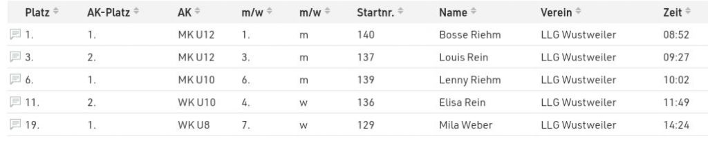Auch beim Schülerlauf blieb der Sieg in LLG-Hand. Bosse sicherte sich den Gesamtsieg und damit auch Platz 1 in der AK MKU12. In der gleichen Klasse startend folgte Louis auf Gesamtplatz 2 und Platz 2 AK. Gesamtplatz 6 und der AK-Sieg  in der männlichen U10 ging an Lenny. In der U10 bei den Mädels machte Elisa Platz 2 klar, Mila machte das tolle Abschneiden unseres Nachwuchses mit dem Sieg in der WKU8 perfekt.