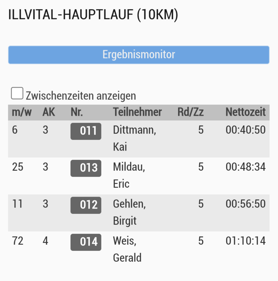 Bei den 10 km gab es an Max Gebhard von der (nextgendingmad) kein Vorbeikommen, er siegte in 34:45 Minuten. Ihm folgten Mohamed Hegazy (SV GO! Saar 05) und Mambo Makiadi (Hartfüssler Trail e.V.) auf den Plätzen 2 und 3. Bei den Frauen war Sophia Mudter (Aktion Palca) die klare Siegerin, Anna Lindtner (Eintracht Frankfurt Triathlon) und Sarah Kronberg (LTF Theeltal) komplettierten das Podest. Schnellster LLGler war Kai, der mit persönlicher Bestzeit auf Platz 6 im Gesamtfeld landete. In der AK belegte er Platz 3, was auch Eric und Birgit gelang.