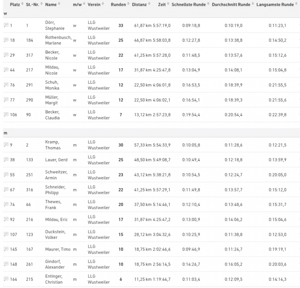 Bei den Männern spulte Thomas die meisten Kilometer ab. Beim ersten Lauf für die LLG direkt ein Ultra, dazu noch eine Top10-Platzierung. Es folgten LLG-intern unser neuer Kilometerheld Gerd und Armin, die ebenfalls über längere Strecken zusammen waren und nun ebenfalls ihre ersten Ultras für die LLG im Kasten haben. Eine neue persönliche Bestweite erzielte auch Frank, der nun schon recht nah an die magischen 42 km herangerückt ist. Wer weiss, was das nächste Jahr so bringt.