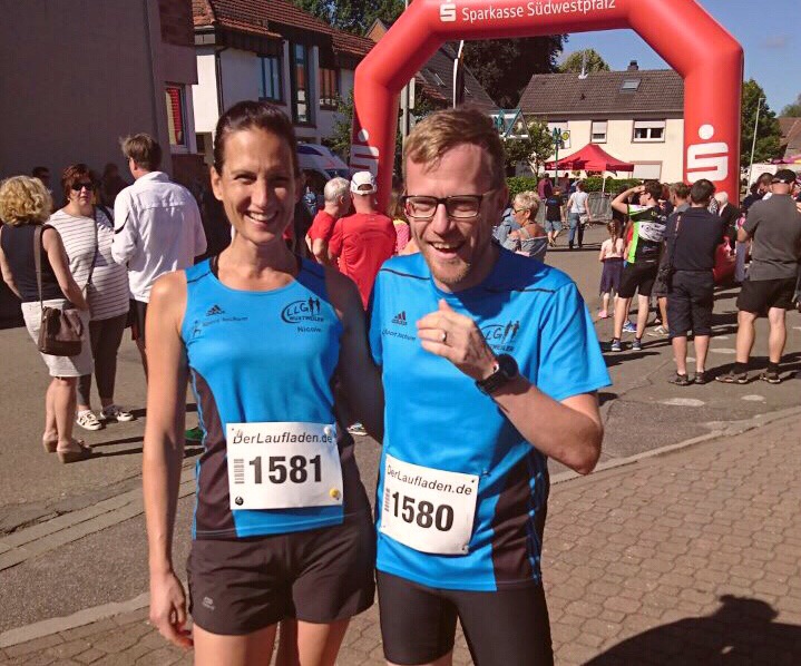 Perlwein und Gemeinschaftsdusche Nicole Becker und Andreas “Müsli” Holweck sind der Einladung eines Exilsaarländers gefolgt und haben im pfälzischen Heltersberg den 10 km-Lauf absolviert. Der neue Kurs über 2 leicht