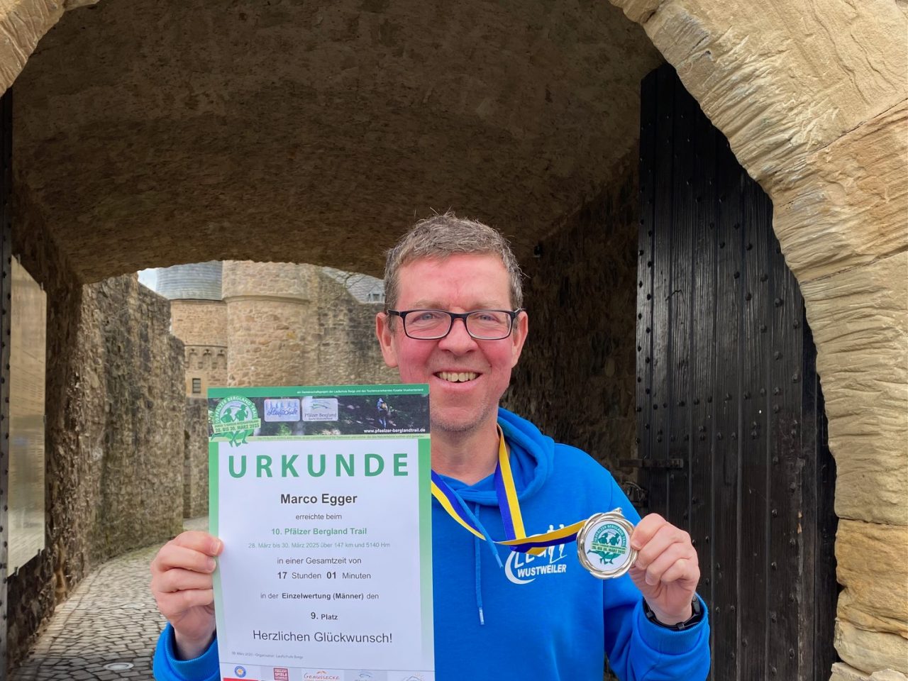 3 Tage / 3 Ultras Marco Egger hat bereits zum 2. Mal nach 2022 am Pfälzer-Berglandtrail teilgenommen. Die Jugendherberge Wolfstein bildet am Donnerstag Abend das Zentrum für rund 80 Teilnehmer