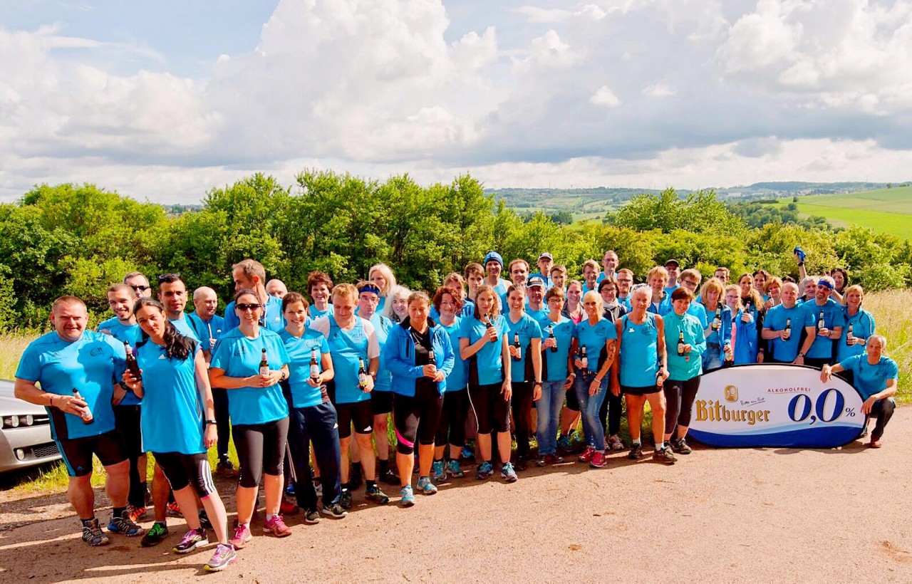 Trotz 0,0% – Illinger Hosterwald komplett blau… Am Samstag wurde unser Lauftreff durch den Besuch von Team Bitburger und Saarbrücker Zeitung verschönt. Die etwa 60 Teilnehmer in Blau wurden nach