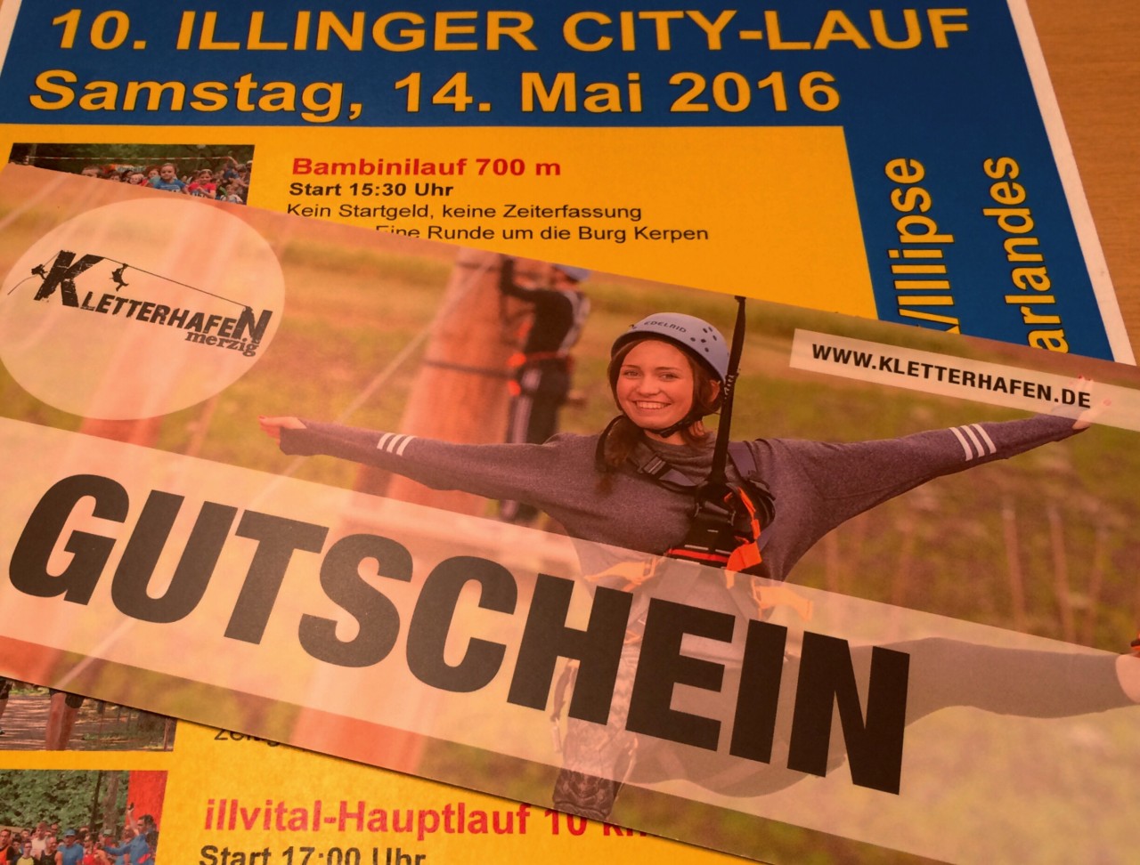 NEWS zum Illinger Citylauf 2016 – Gutscheinaktion vom Kletterhafen Merzig Es gibt auch in diesem Jahr wieder tolle Preise unseres Partners zu gewinnen. Wir prämieren die teilnehmerstärksten Vereine/Gruppen sowie die