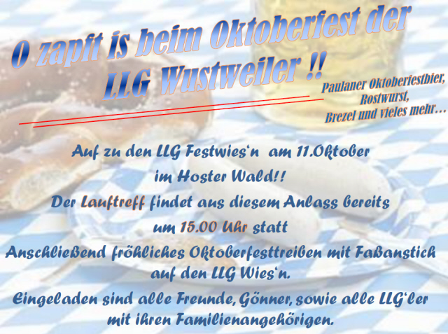 Zum Oktoberfest der LLG Wustweiler am 11. Oktober 2014 auf der LLG-Wies’n am Hosterwald laden wir alle Freunde, Gönner, sowie alle LLG’ler und Familienangehörige herzlich ein. Lauftreff ist bereits um