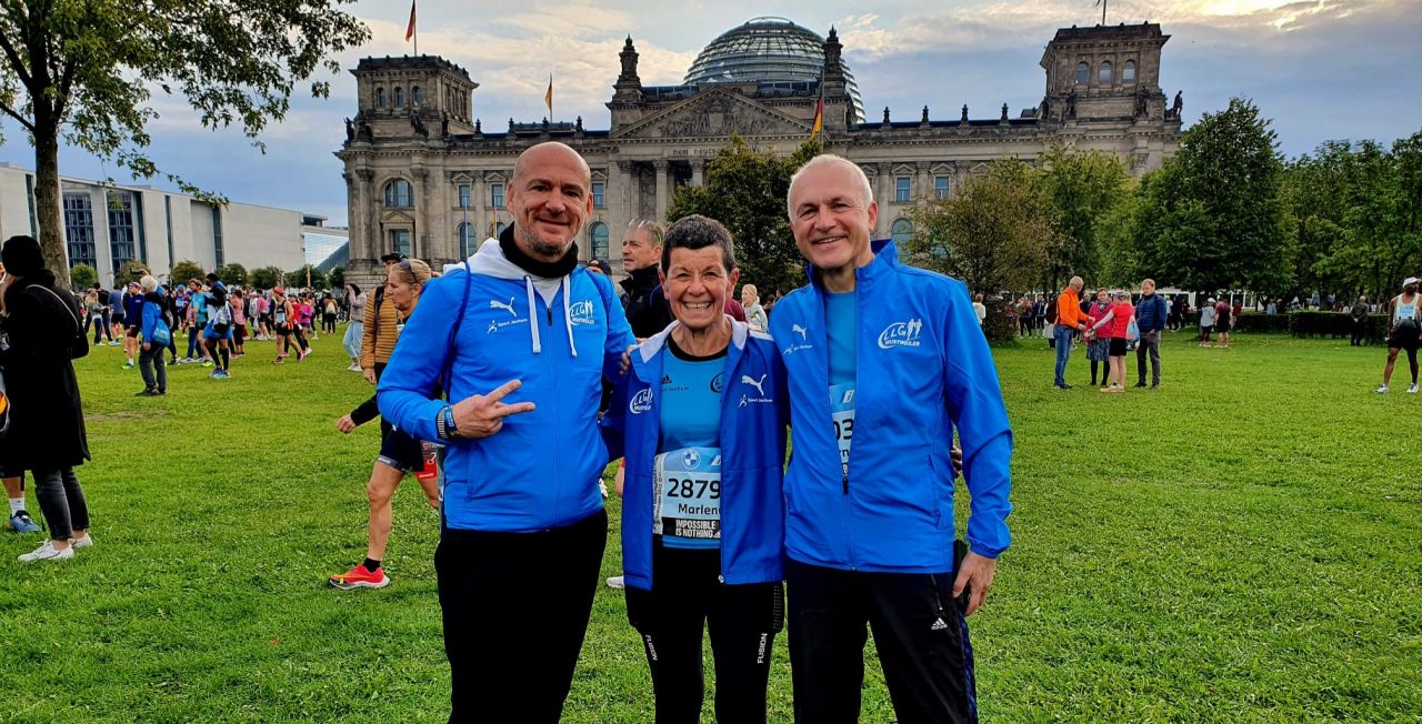 Team Blau mittendrin beim Rekordlauf Am Sonntag wurde auf den Straßen Berlins wieder Sportgeschichte geschrieben: Weltrekord bei den Männern, Streckenrekord bei den Frauen. Und mittendrin Stefan, Marlene und Bernd, die