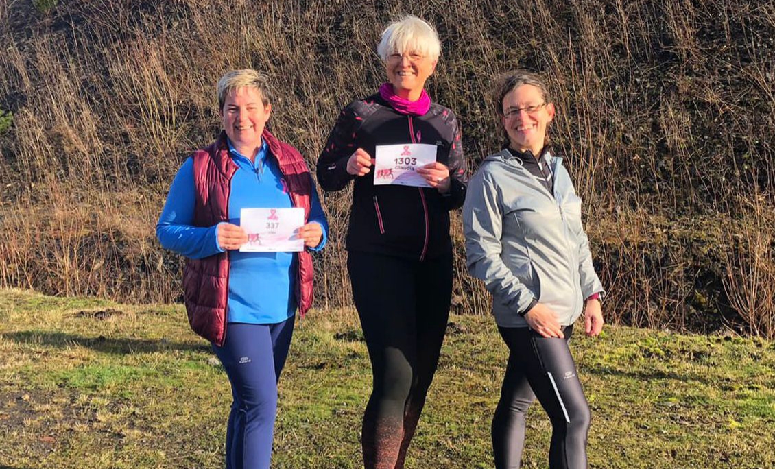Spendenlauf zum Weltkrebstag Bei perfektem Laufwetter trafen sich Tanja Ringeisen, Claudia Becker und Elke Flormann am Samstag an der Alm, um zum Weltkrebstag ihre 5 km für den virtuellen Spendenlauf