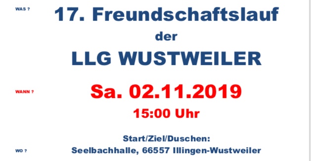 Bitte Termin vormerken, mitmachen und weitersagen: Sa. 02.11.2019 – gemeinsam durch die Wälder um Wustweiler Start: 15:00 Uhr Seelbachhalle, 66557 Illingen-Wustweiler kein Startgeld – keine Zeitnahme – kein Wettkampf 1