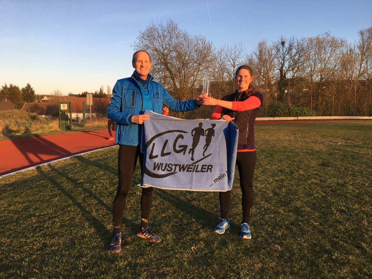 Heinz Schuh begrüßt Anke Piechotta! Die LLG Wustweiler freut sich über ihr 400tes Mitglied. Aus diesem Anlass überreichte Heinz während des Trainings auf dem Illinger Sporti Anke Piechotta als Willkommensgruß