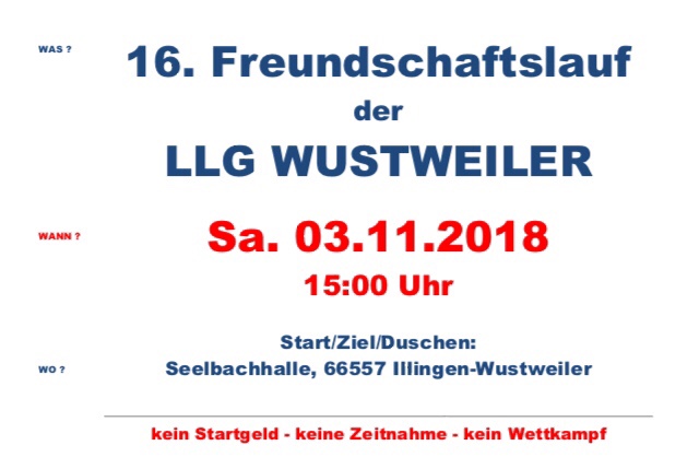 Bitte Termin vormerken, mitmachen und weitersagen: Sa. 03.11.2018 – gemeinsam durch die Wälder um Wustweiler Start: 15:00 Uhr Seelbachhalle, 66557 Illingen-Wustweiler kein Startgeld – keine Zeitnahme – kein Wettkampf 1 Stunde